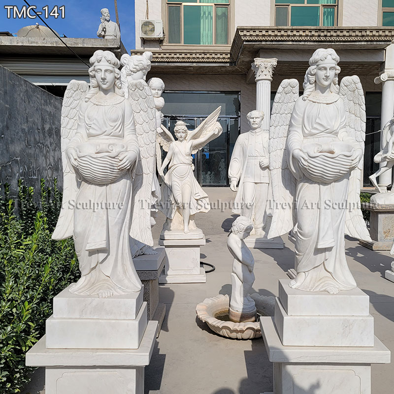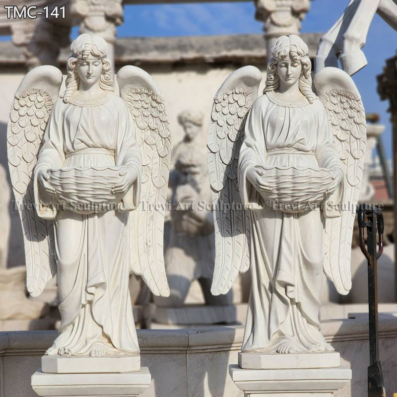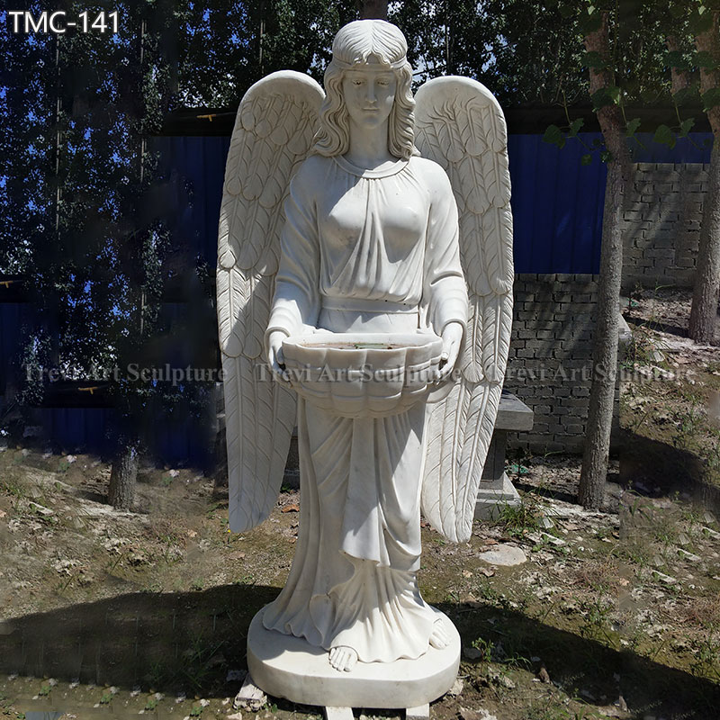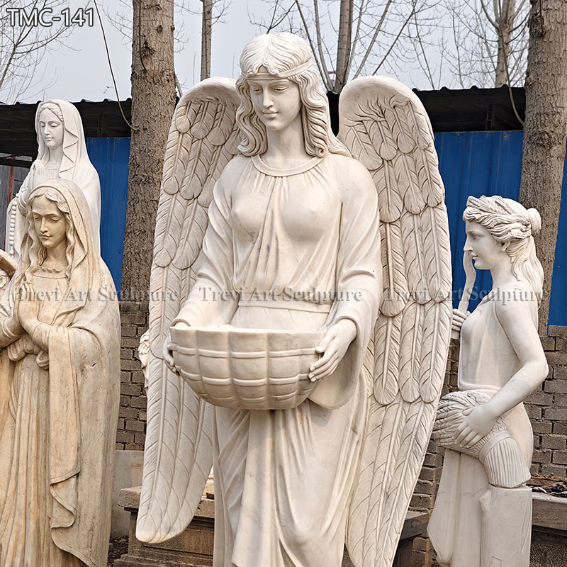 The statue is made from premium pure white marble, known for its durability and timeless beauty. Every detail is skillfully carved, from the angel’s majestic wings to the delicate folds of its flowing robe. The angel’s serene expression and the intricate patterns on the basin showcase the high level of craftsmanship. The polished surface adds a refined touch, ensuring the statue stands out as an elegant centerpiece. This statue combines beauty, craftsmanship, and spirituality, making it a cherished piece for generations.