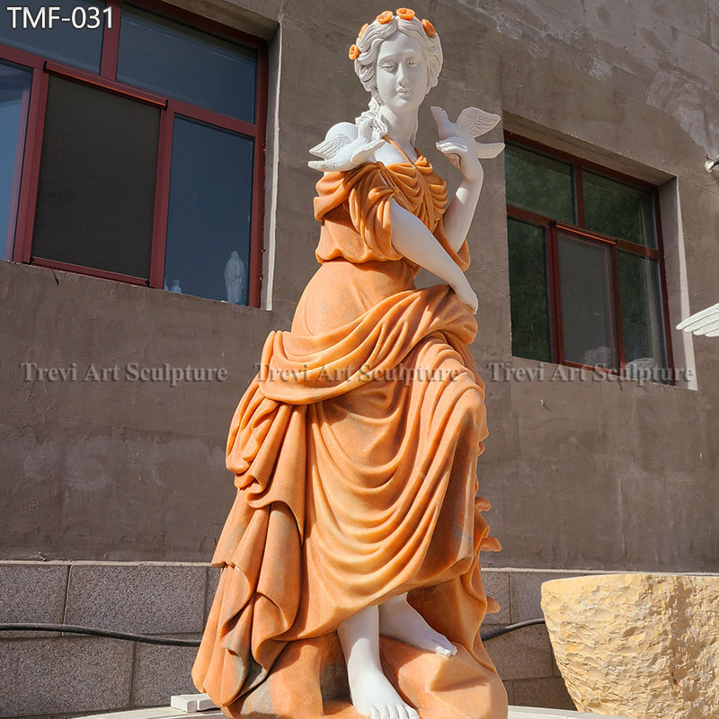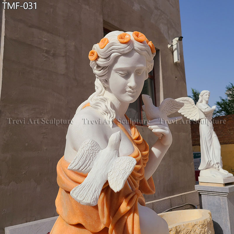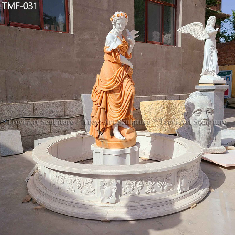 This exquisite outdoor water fountain statue features a circular fountain basin with an elegant female statue standing gracefully at its center. The lady statue is carved from premium marble, blending warm orange and pristine white colors to create a vibrant and eye-catching centerpiece. The rich colors make this fountain a perfect addition to any garden, courtyard, or outdoor setting.