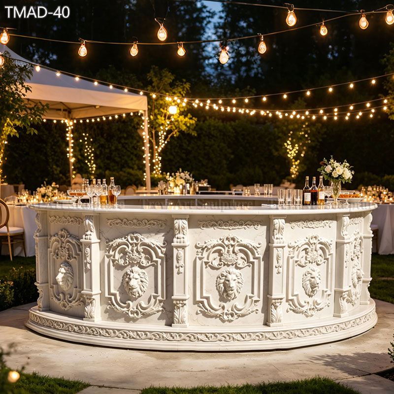 This custom white marble bar counter features a refined, classical design. The front façade has lion head reliefs, symbolizing strength and prestige, surrounded by intricate ornamental carvings. The curved structure creates a welcoming and functional serving space, making it ideal for both social and commercial settings.