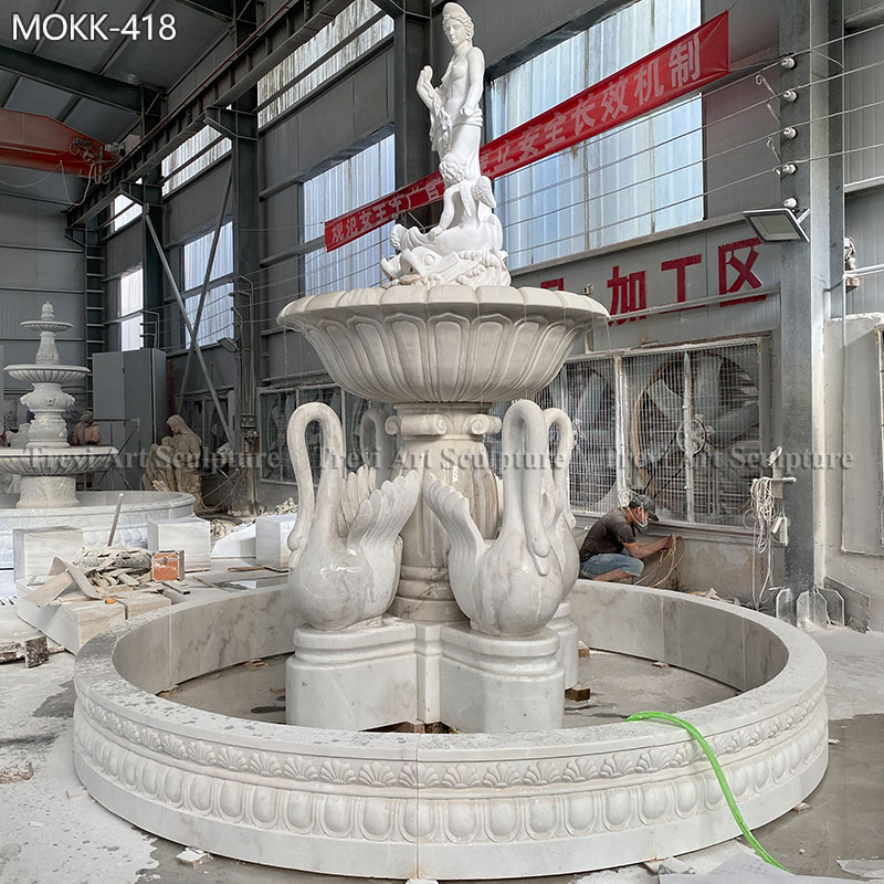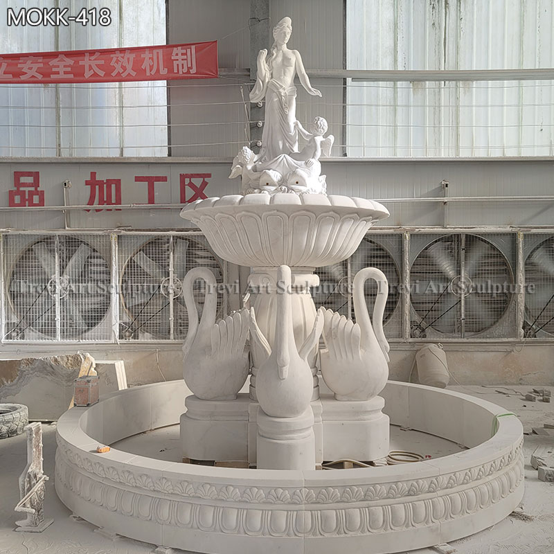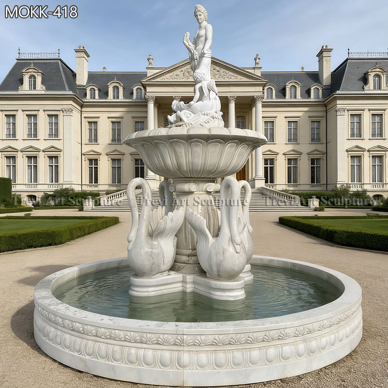 This fountain features a classic design that has various elements. With a diameter of 4 meters, it incorporates sculptures of Greek female figures, making it an ideal centerpiece for a classical estate. Furthermore, four swan sculptures adorn the base of the fountain, further adding to its elegance.