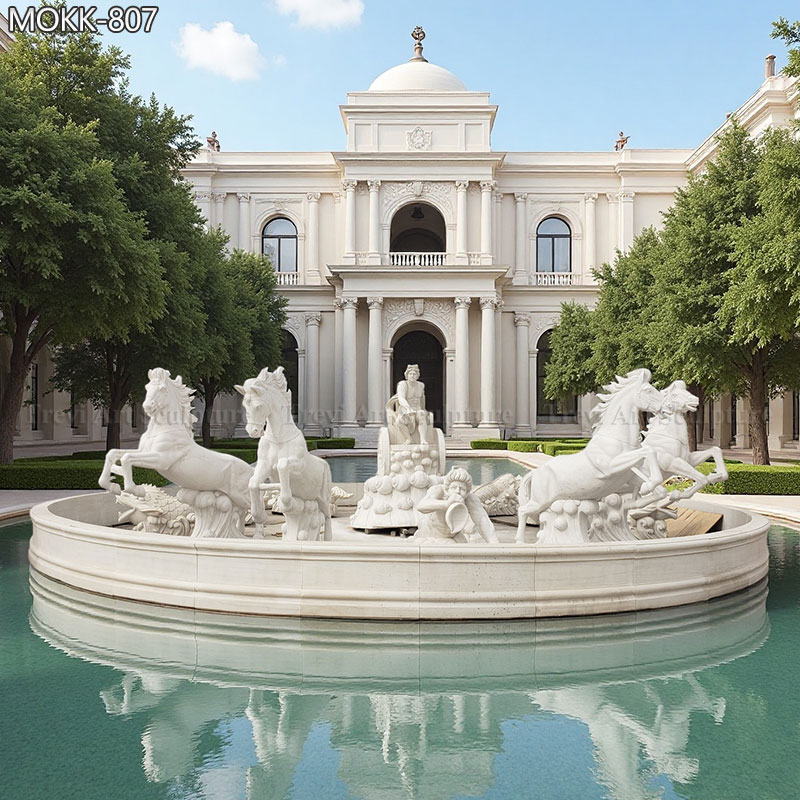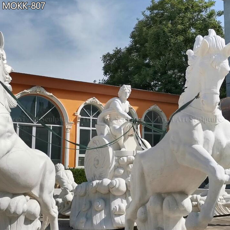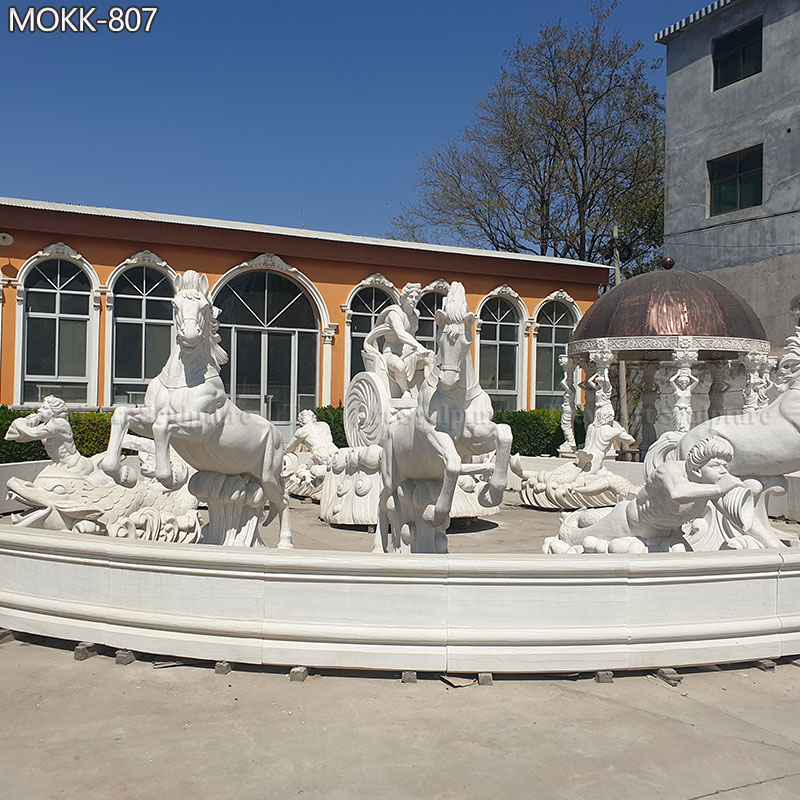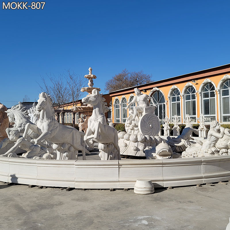 The classic Apollo marble fountain is made from high-quality white marble. The design of this fountain is magnificent. You can see huge tame horses and Greek mythological figures in this large fountain. Sitting on a chariot is Apollo, the god of the sun in Greek mythology. So he will be flying in the sky together with the four chariots. Combining perfect carvings and water cascades, this large fountain is sure to be the ultimate display of fine and luxurious outdoor fountain decoration.