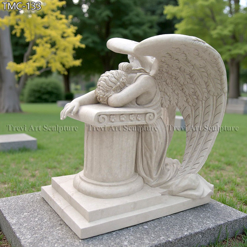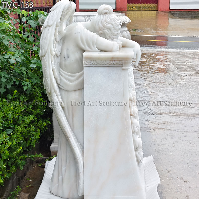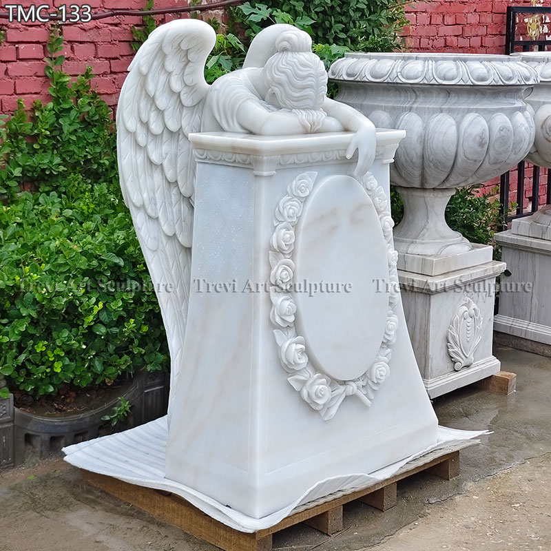 Standing at 1.4 meters (55 inches) tall, this memorial features a sorrowful angel leaning over a headstone, symbolizing eternal mourning and love. Meticulously hand-carved from pure white marble, the statue showcases intricate details, from the angel’s delicate wings to the carved floral wreath adorning the headstone. Its serene and heartfelt design makes it a fitting centerpiece for any cemetery or memorial space.