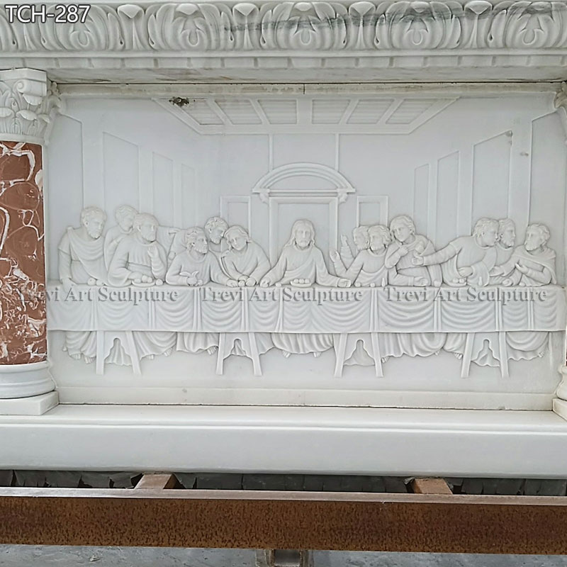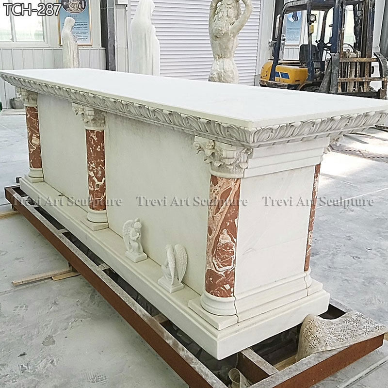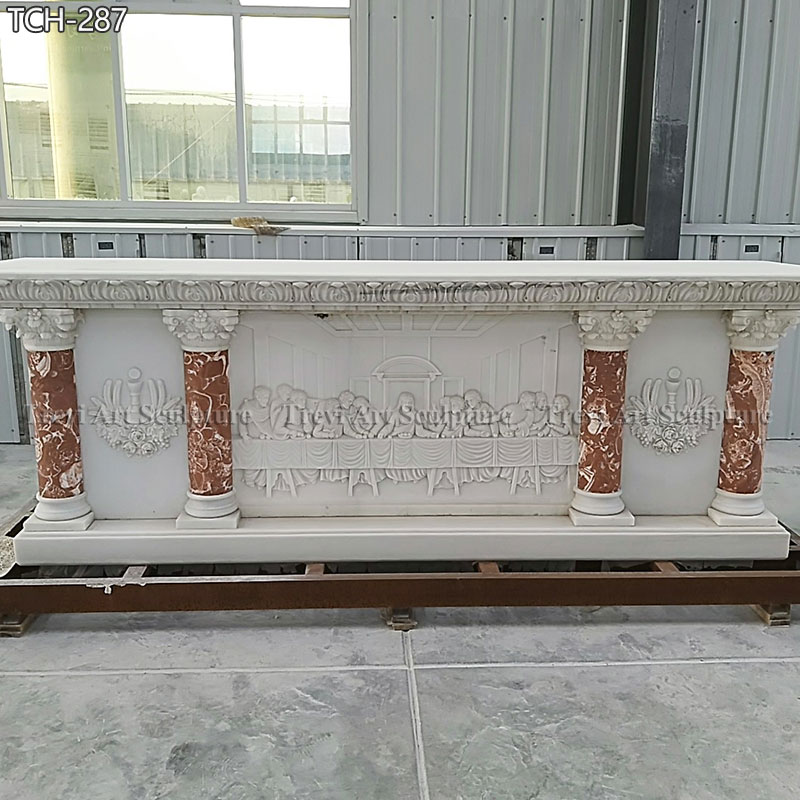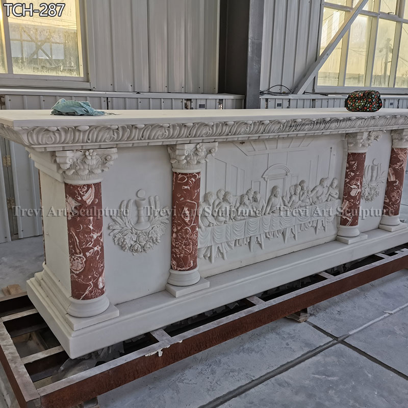 This traditional catholic altar is made of white and red marble, with ivory white texture flowing with natural gray lines. After a hundred years of wind and rain, it still retains the warm and holy luster of jade. It has a strong religious artistic atmosphere and is suitable for religious spaces such as churches and churches.