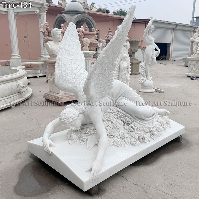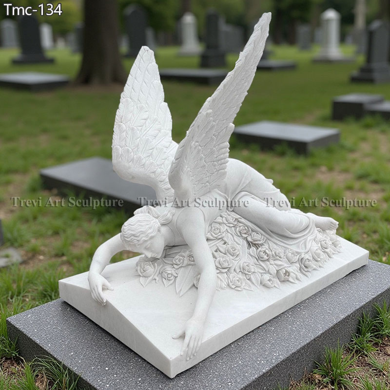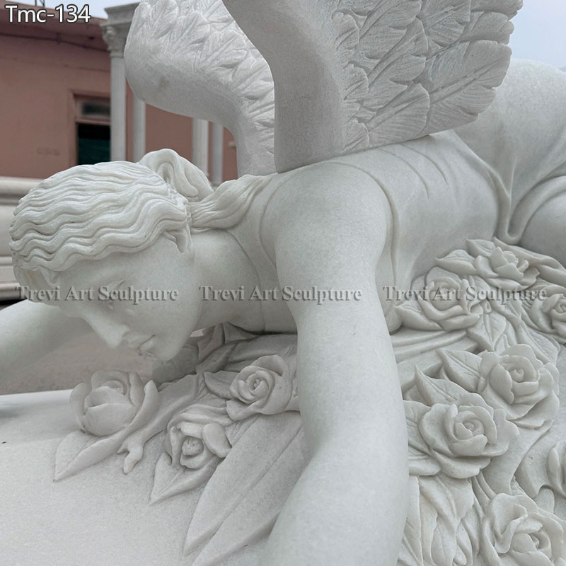 A poignant display of grief and beauty, this reclining angel lies on a bed of roses, her wings spread gently behind her. The finely carved details of the feathers and roses evoke a sense of loss and eternal love. Ideal for cemeteries or remembrance settings, this work of art pays homage to the enduring emotions of the human spirit.