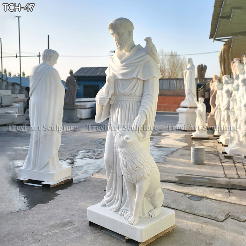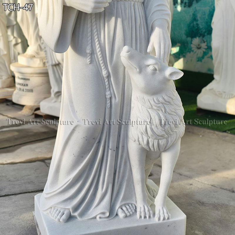 The St Francis Statue with Animals is an exquisite 6-foot marble sculpture that captures the essence of St. Francis of Assisi, the patron saint of animals and the environment. This remarkable piece features St. Francis gracefully standing with a loyal dog at his feet, birds perched on his shoulders, and a gentle rabbit cradled in his arms.