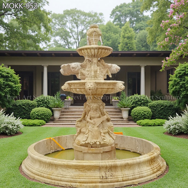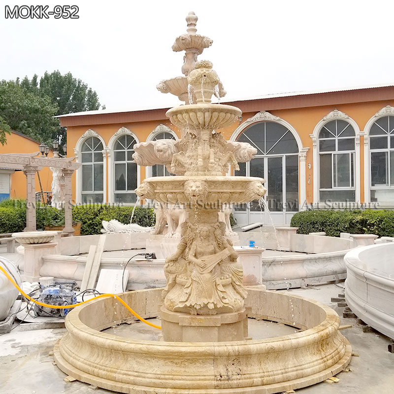 This marble fountain with a lion head relief is very special and beautiful. First of all, the center of the tiers white marble fountain is a lion head from top to bottom. The first bowl features four vaulting horses. The second bowl is a lion head design. One of the fountain designs has four ladies playing different instruments. Then we made a base for the pump room under the seated ladies.